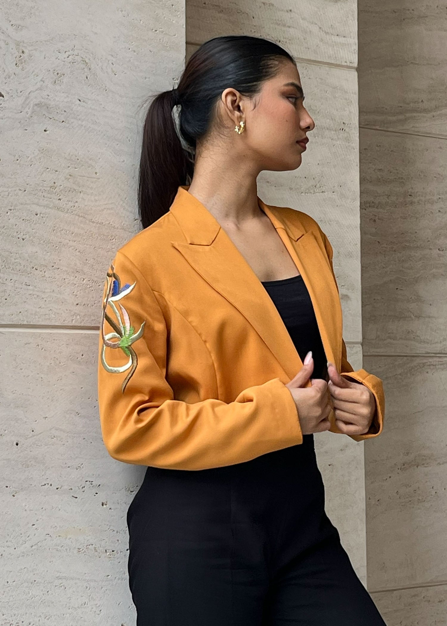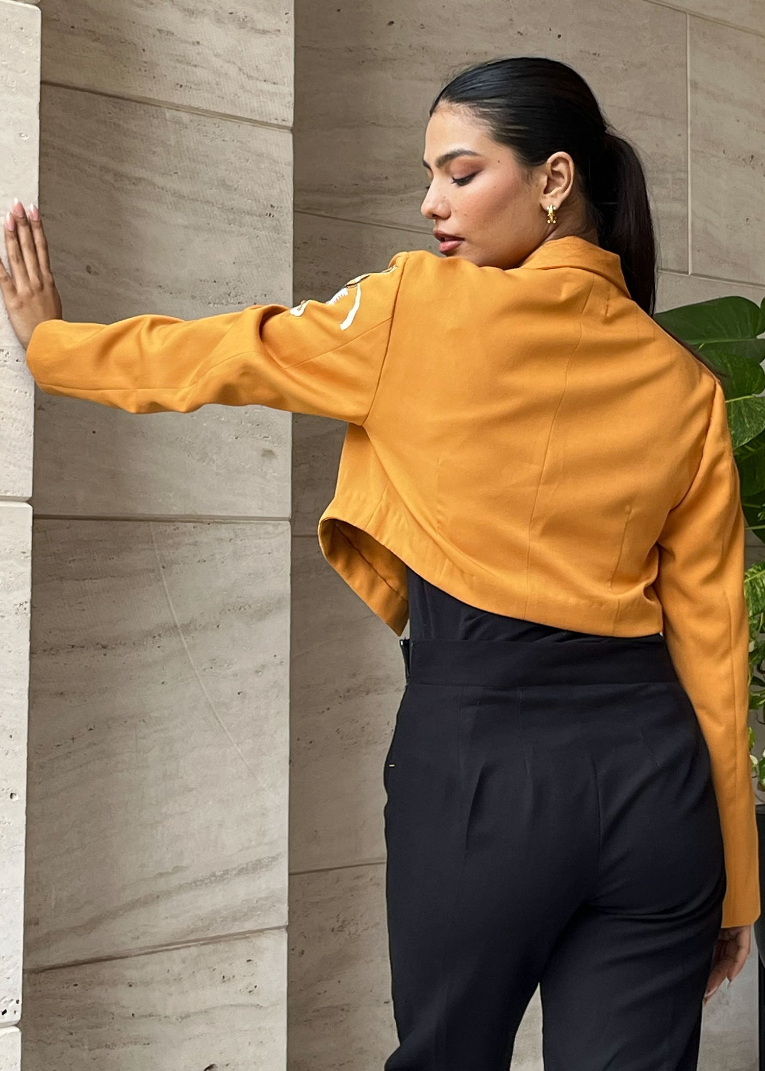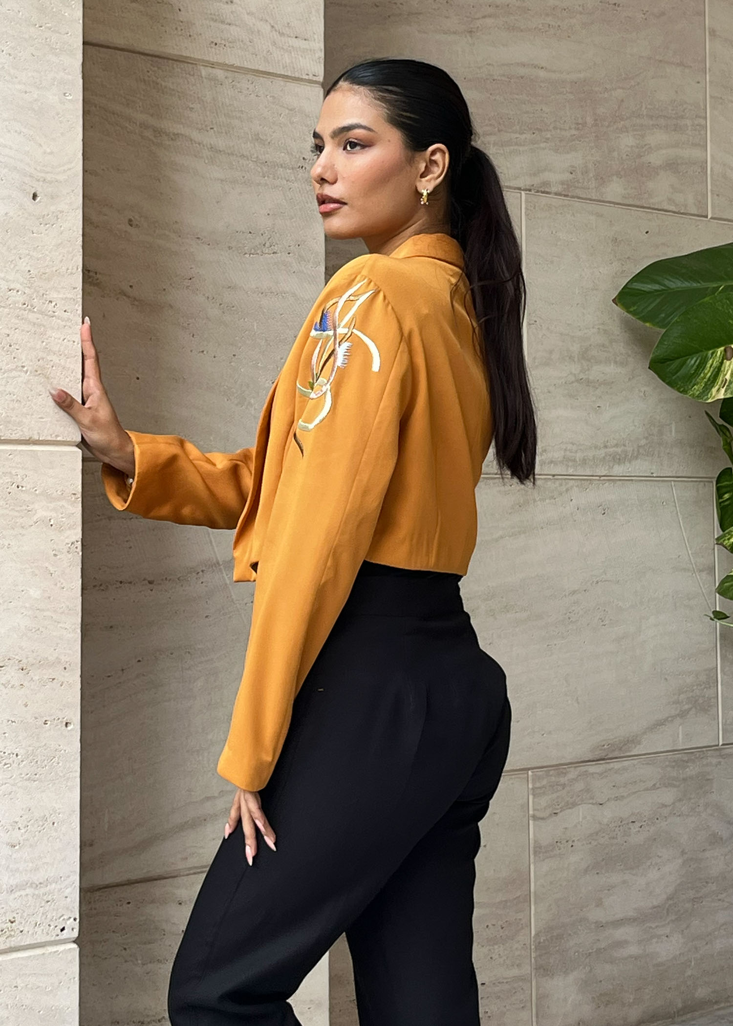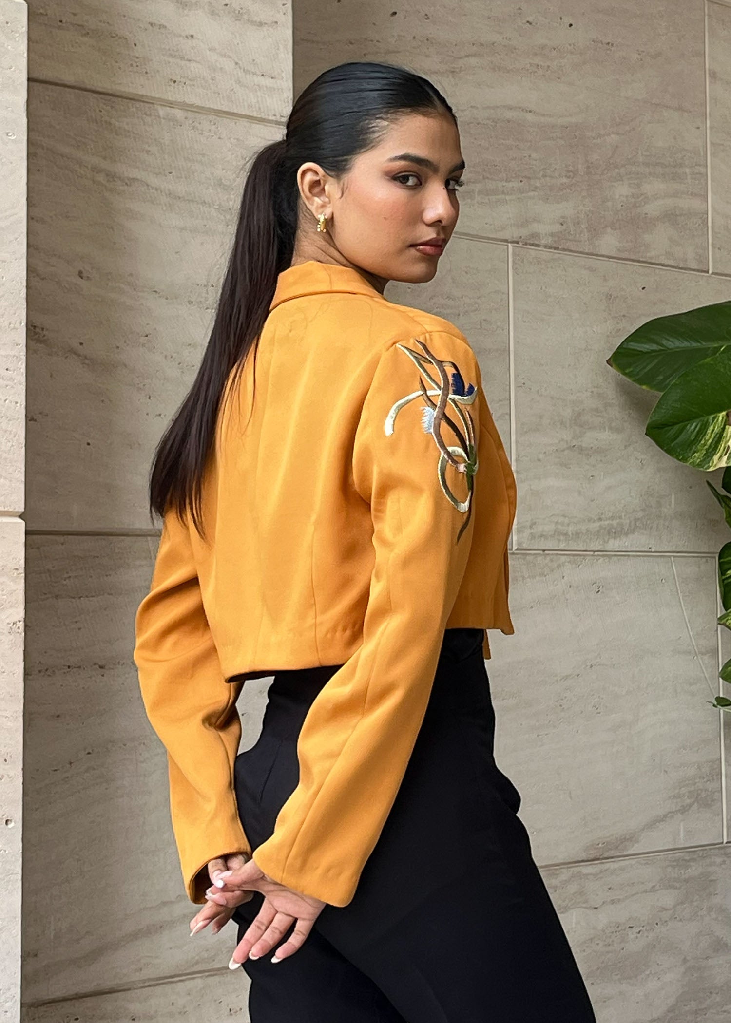 Description: Mustard blazer with contemporary open front, embroidery on the sleeves.