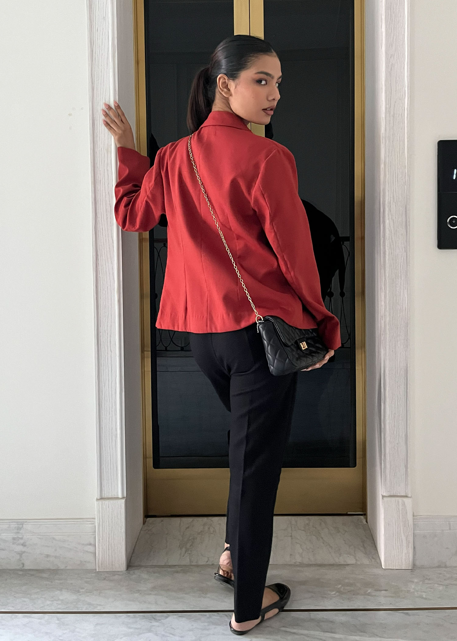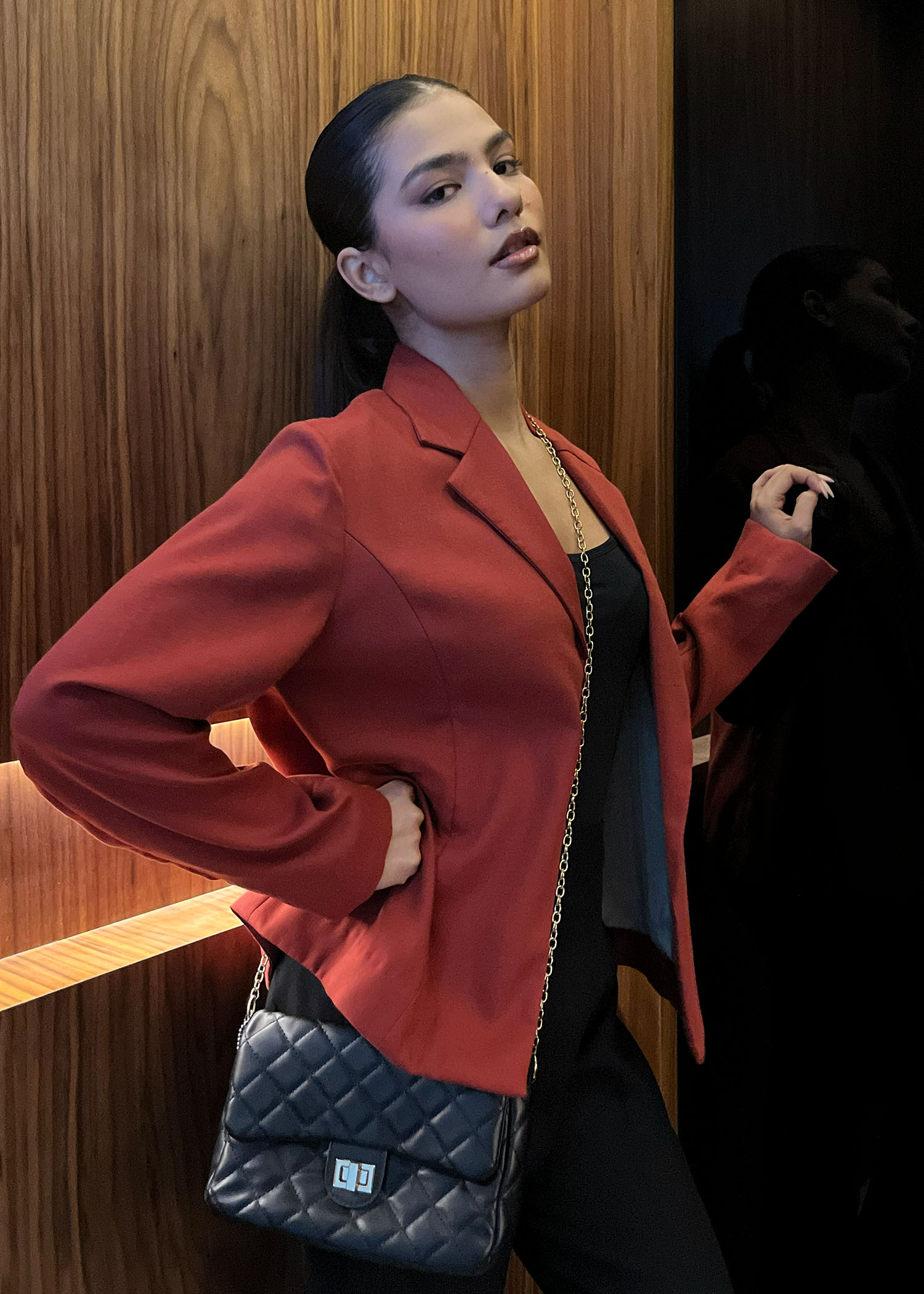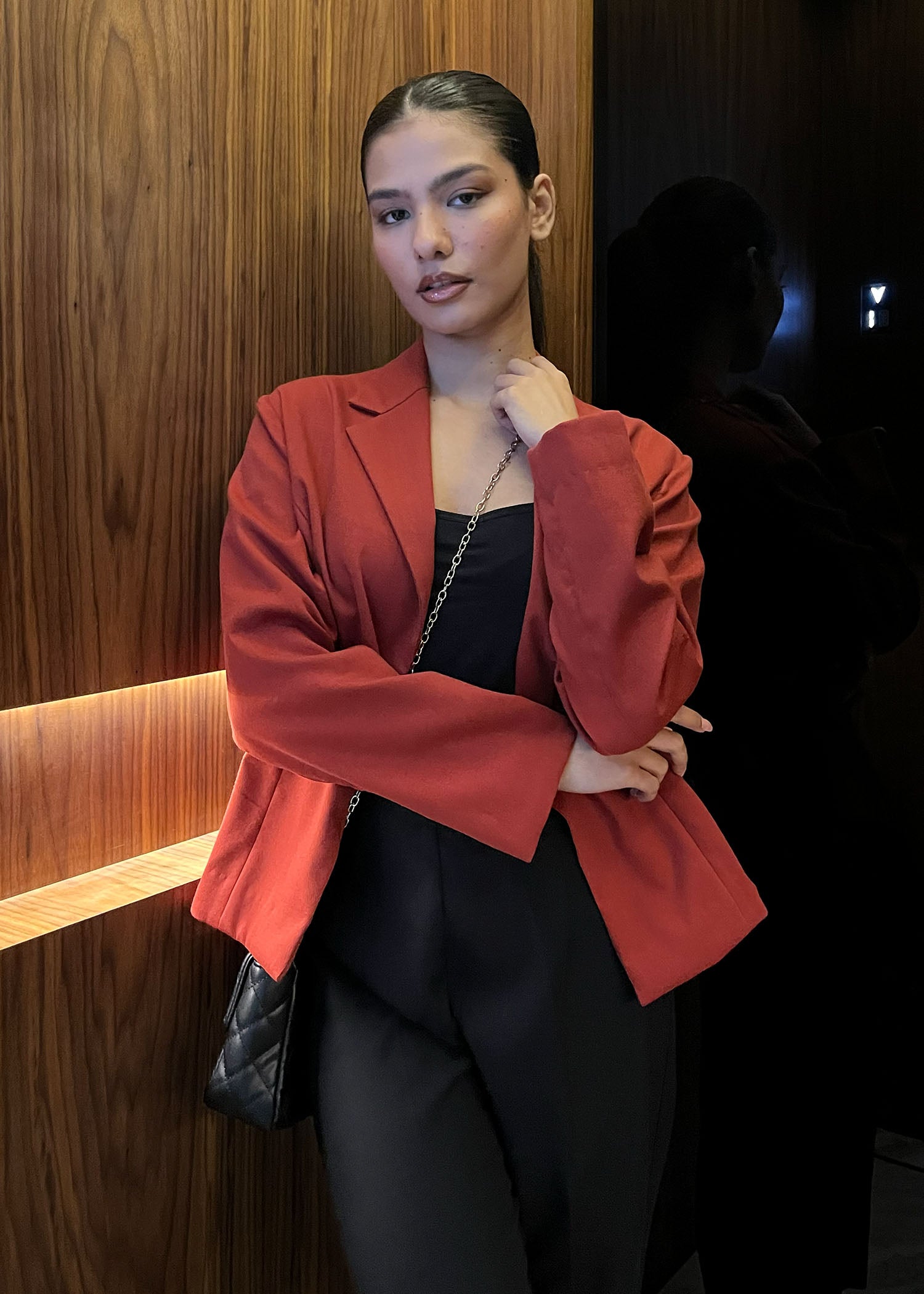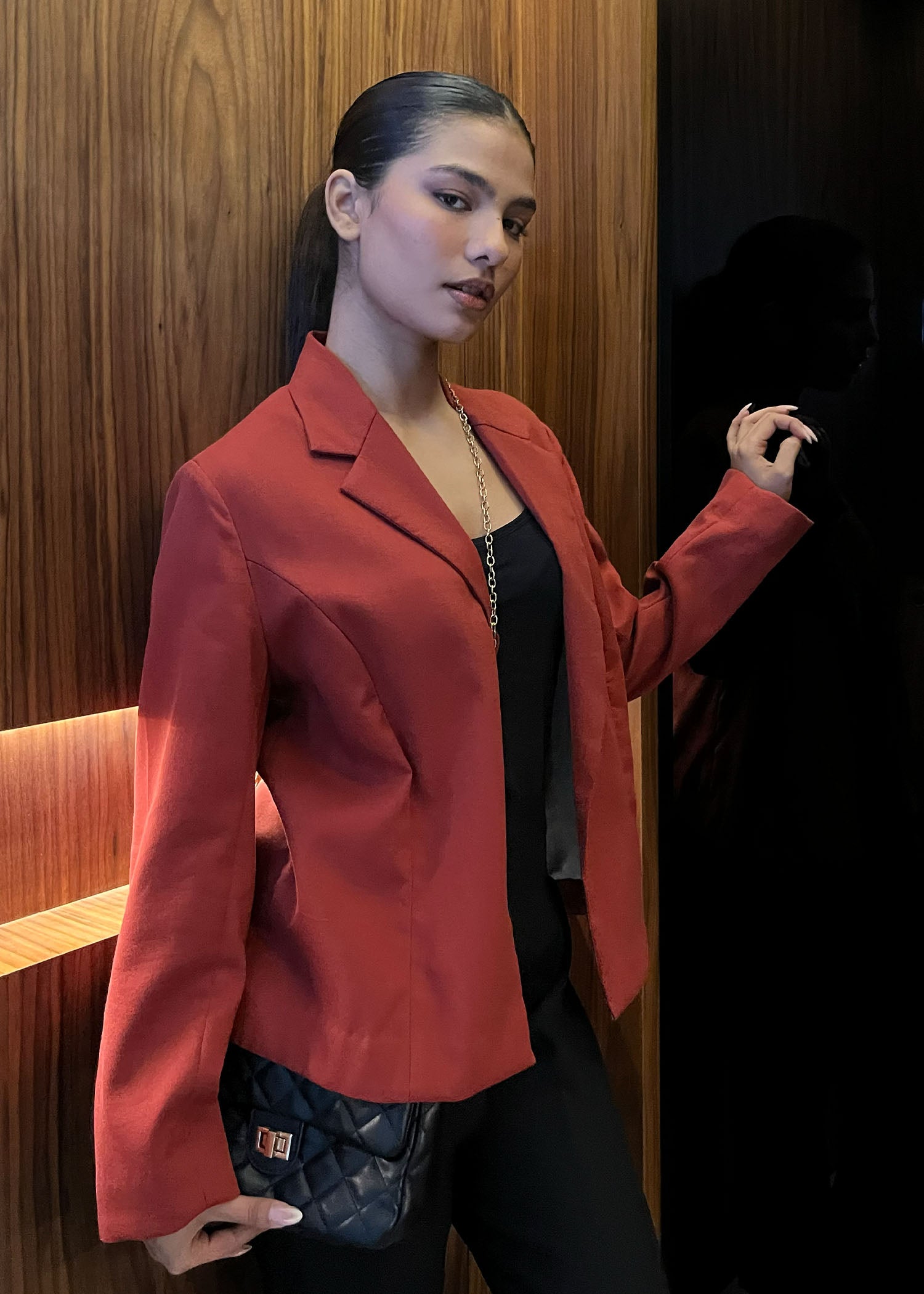 Description: Basic rust blazer, made with twill, perfect for winter nights and everyday functionality.