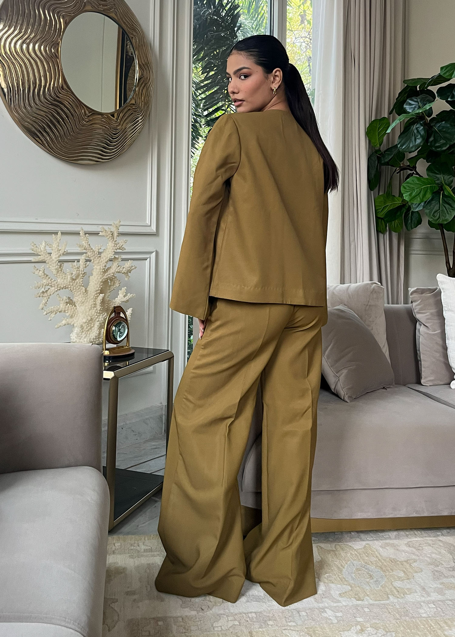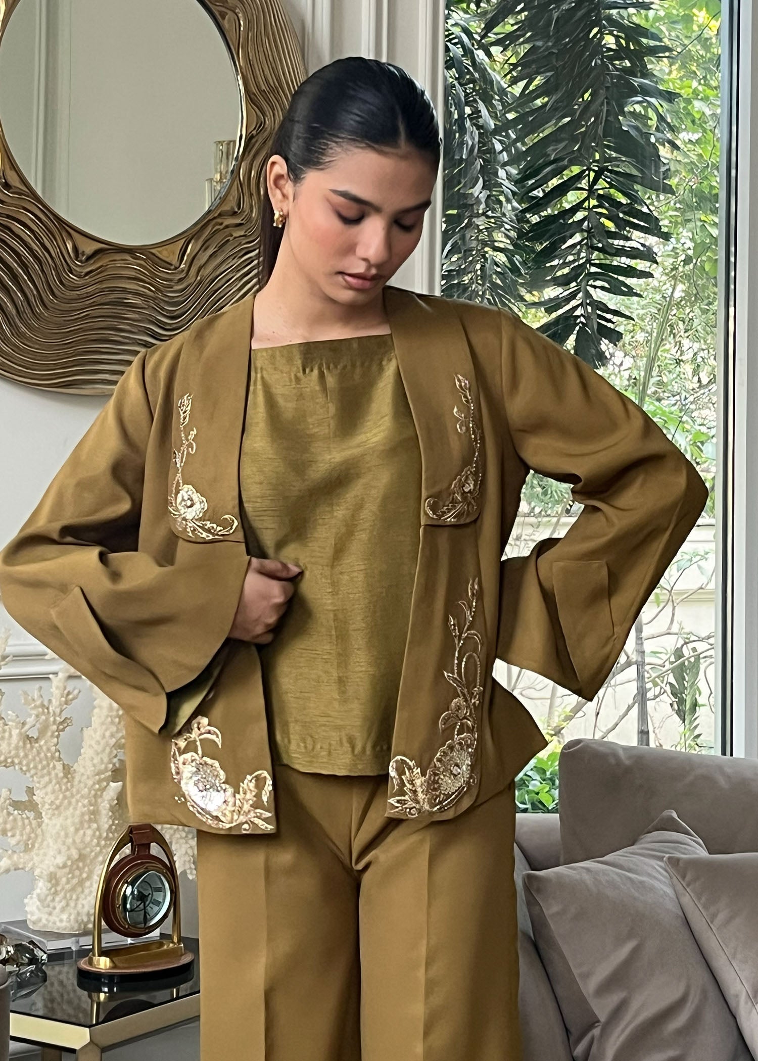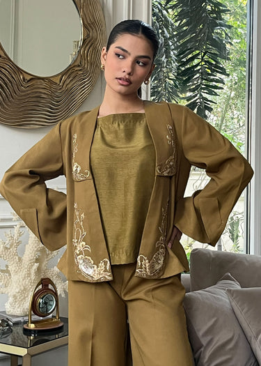 Description: Olive green blazer made, with open front, with embroidered lapel.