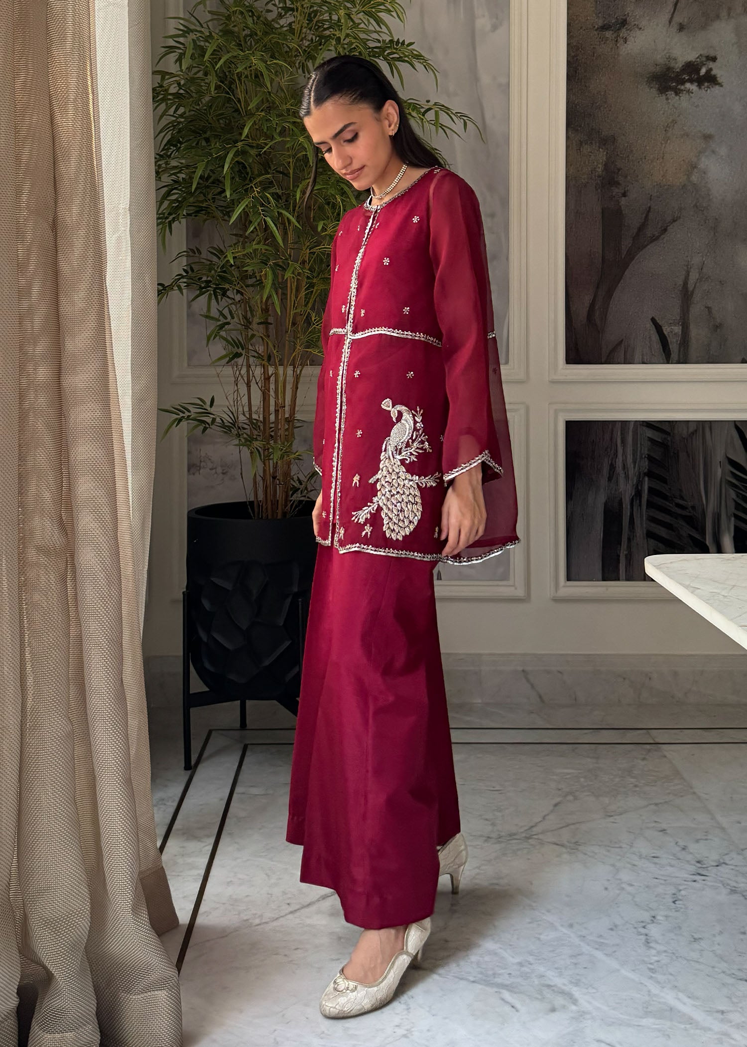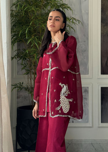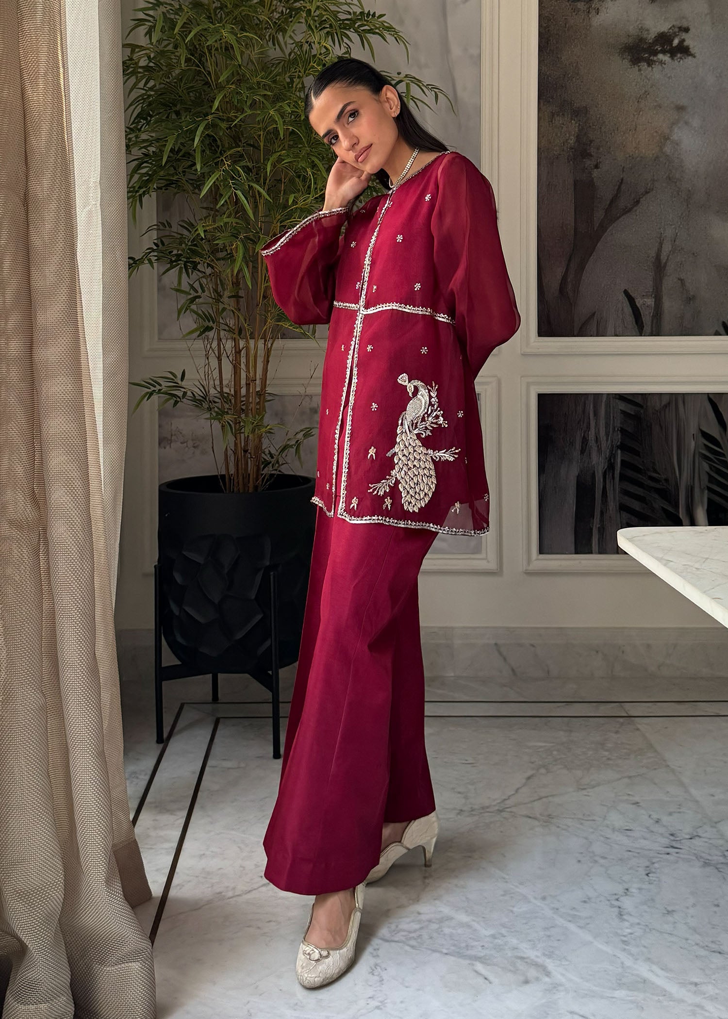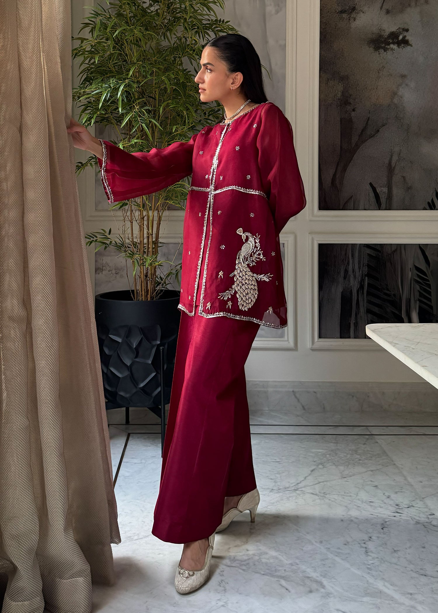 Description: Crafted in a deep maroon hue, this outfit features subtle hand embellishments and a striking peacock embroidery that adds an artistic touch. Designed for effortless sophistication and modern elegance.