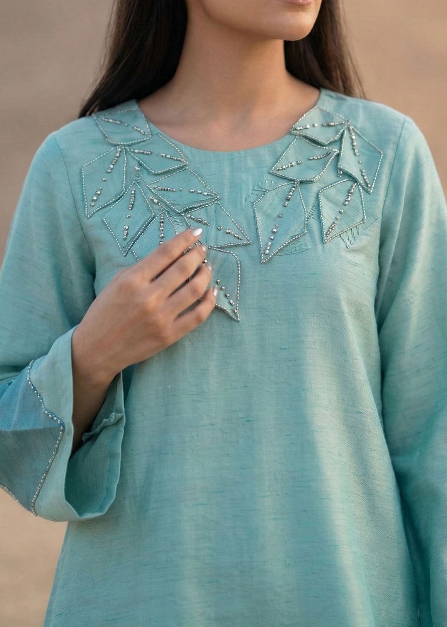 Description: Detailed with elegant embellishments and intricate embroidery, this outfit offers a refined look that merges contemporary style with enduring sophistication.Color: Sky BlueFabric: Shisha silk