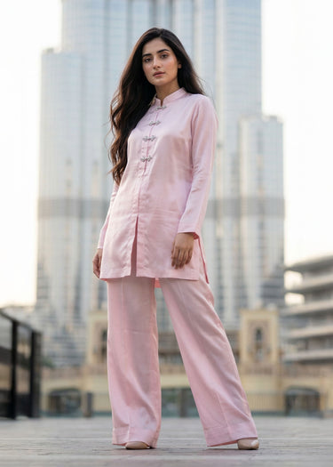 Description: This straight-cut kurta brings together a clean silhouette and delicate front button detailing for a look that feels subtle, graceful, and easy to wear. It is paired with relaxed wide-leg trousers for added comfort and ease.